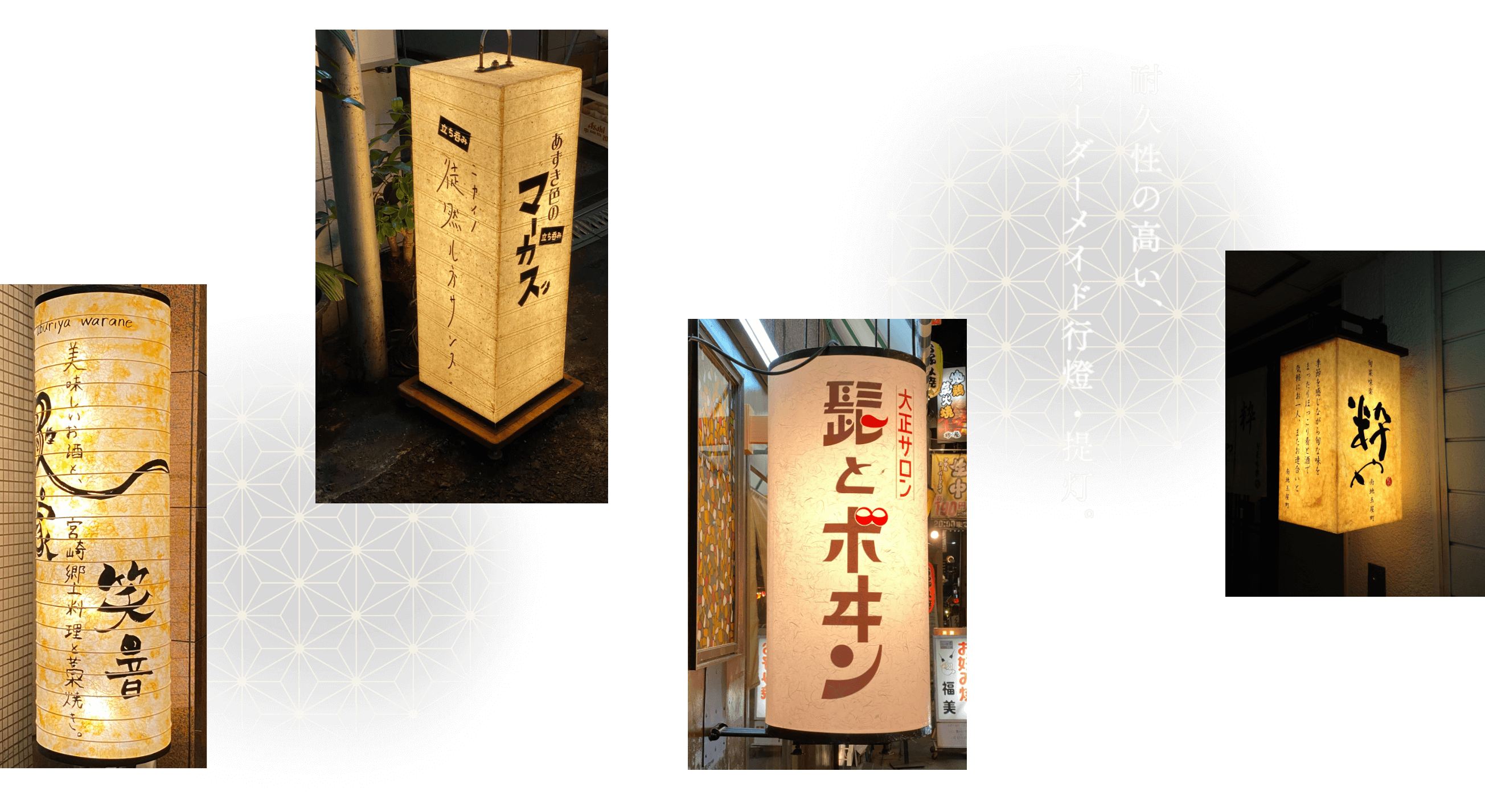 既存の行燈は、代わり映えしないデザインばかり。また破れやすいなど、耐久性も低いのが難点でした。これらを改良し、和紙の「趣のあるサイン」を作りたいとの思いから、樹和紙の行燈は生まれました。